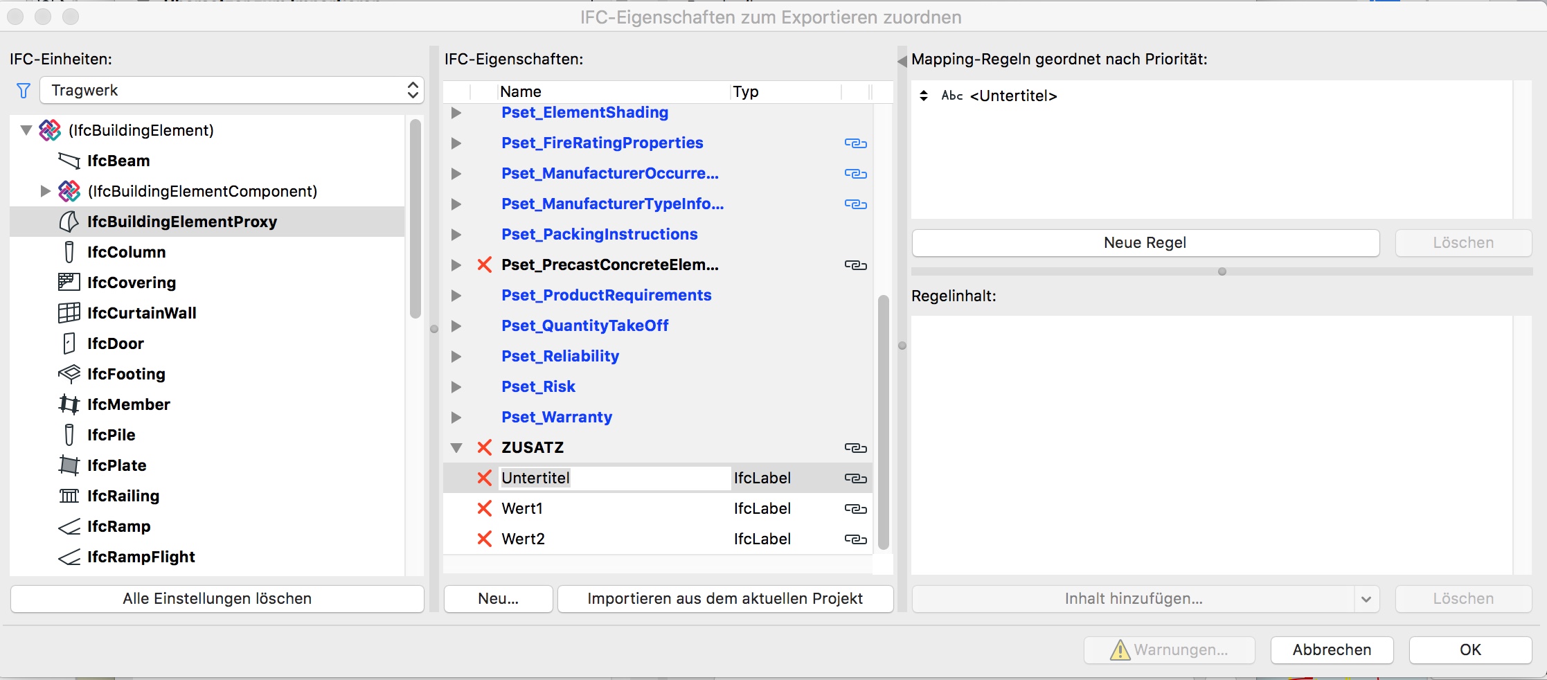 There fore we create an custom-attribute under a chapter Messenger (see attachments Messenger.Untertitel, Messenger.Wert1, Messenger.Wert2), see attachments -> they are assigned to IFC Properties (IFC.Zusatz.Untertitel etc.)