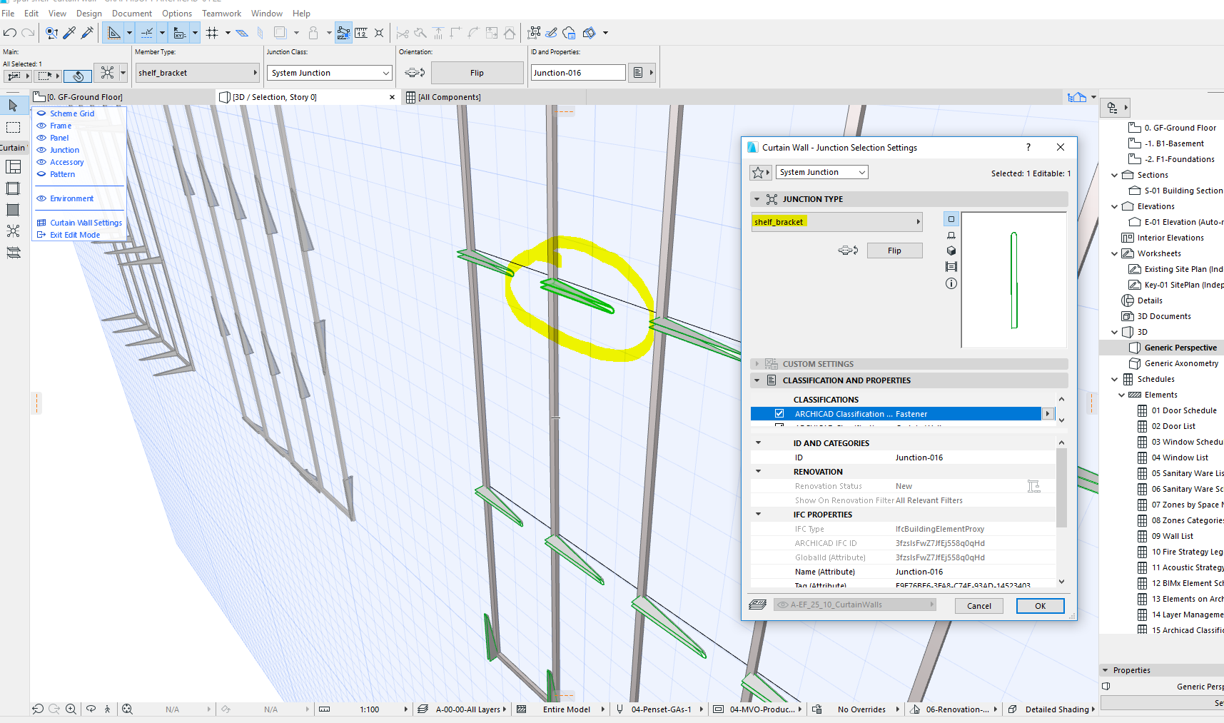 The “Z” direction is always perpendicular to the curtain wall. The junction element only knows this, and the numer of frames at it’s anchor and their direction. Everything should be calculated based on this. Creating a series of elements shown on the images seems to be easier with accessory elements.